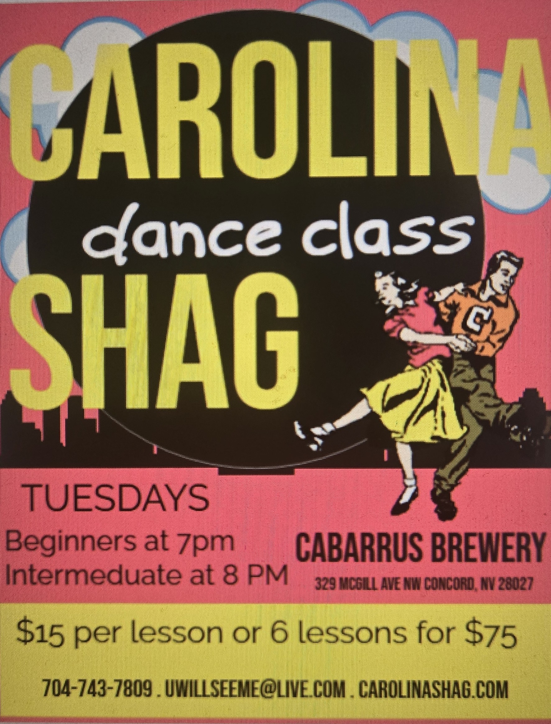 Cabarrus Brewery 329 McGill Ave NW Concord, NC each Tuesday Beginners and Beginner II at pm and Intermediate and 8pm.
